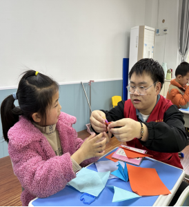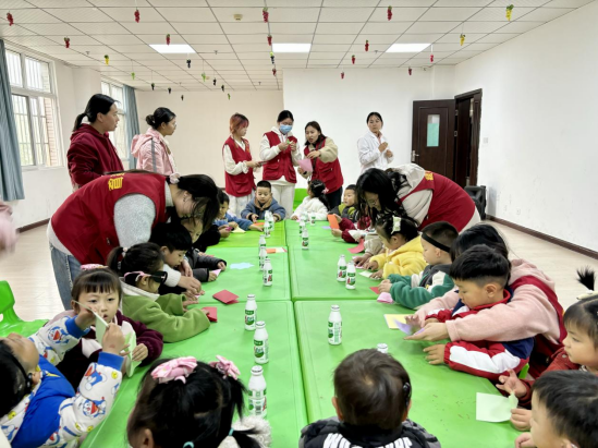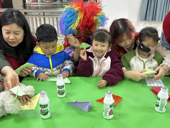志愿者给孩子们带去娃哈哈AD钙奶,玩具和学习用品,采取文体康复形式,教孩子们叠纸飞机捏橡皮泥,给孩子们跳科目三舞蹈,和孩子们做投球运动游戏。两名志愿者特意装扮成小丑,活跃在孩子们中间,大家玩得不亦乐乎,在娱乐中训练孩子们的精细运动能力、手眼协调能力、躯体平衡能力。在志愿者细心陪伴下,每位儿童脸上都洋溢出灿烂笑容。志愿者们的陪伴像春天里的阳光播撒在孩子们心田,让他们倍感温暖、充满自信。